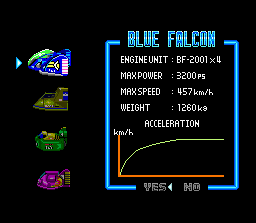 This racer is one of the most well-rounded vehicles on the racing tour. Thanks to the efforts of its pilot, even a novice could perform well in this vehicle. With a well-defended body, average boost power, and good grip, the Blue Falcon is well-balanced and impeccably tuned. Captain Falcon knows every inch of his machine and can make it perform as though it has the best ratings.[1]