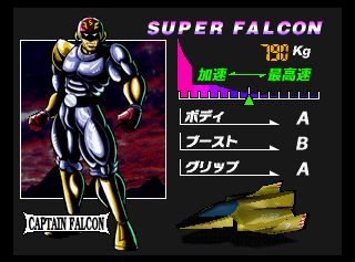 The Super Falcon is a powered-up Blue Falcon and makes its appearance in the Japan-Only N64DD F-Zero X Expansion Kit for F-Zero X. It's one of the "Super" machines along with the Super Cat (powered-up White Cat) and the Super Stingray (powered-up Fire Stingray). Unlike the other super machines, the Super Falcon is a complete upgrade from the Blue Falcon due to its reduced weight (790 kg vs. 1260 kg) and improved stats (ABA stats vs. BCB stats).