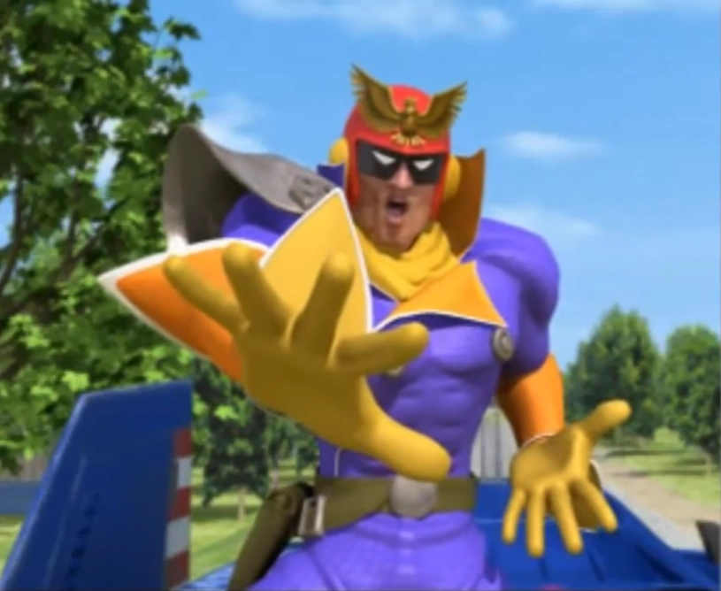 Captain Falcon appears in his own profile video, "Close Call!". When he sees a baby about to be run over by a locomotive, he makes a pose, cartwheels, then grabs the infant, followed by him doing a big jump as the locomotive passes by. The baby is saved, but at the same time, Falcon's pants rip, exposing his boxers. Mrs, Arrow, who is presumably the guardian of the baby due to her distress at the beginning, humorously chuckles at the sight. Falcon stands nervously, and salutes while doing a few shy nods.